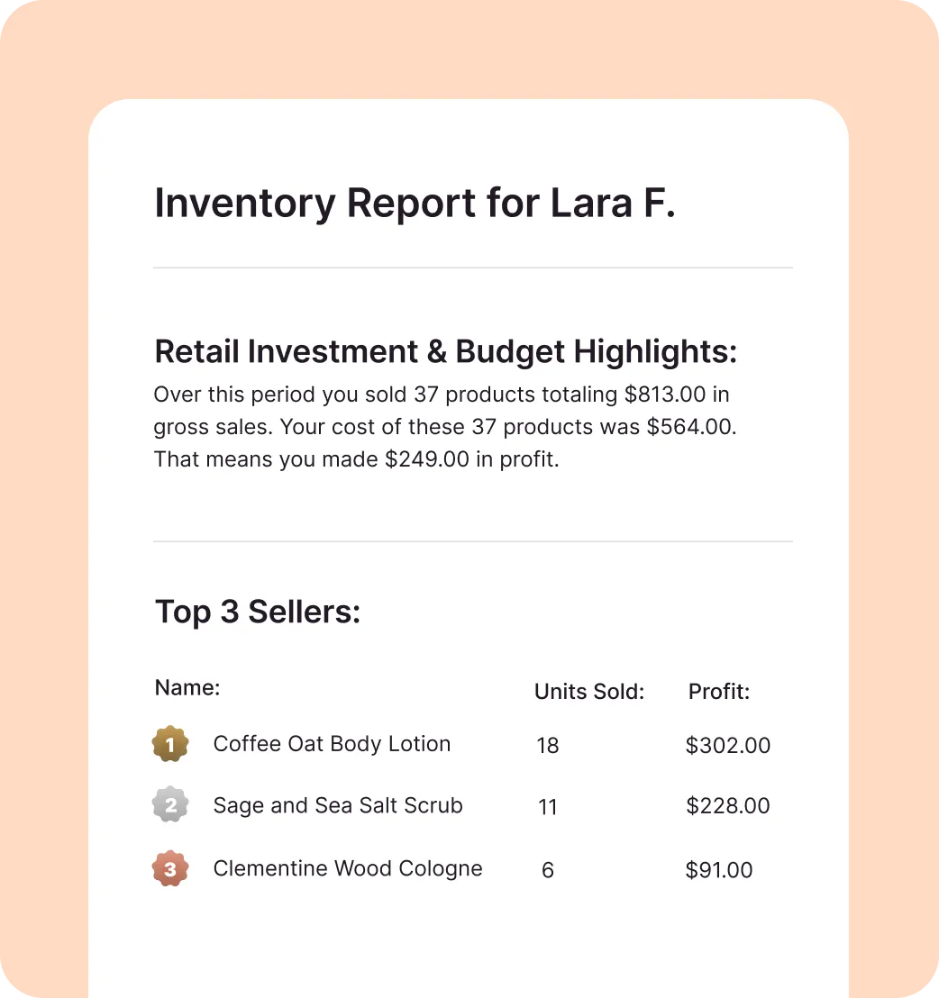 Understand your inventory and sales numbers, identify top sellers, see which products need restocking, and get a snapshot view of all of your stock from one place with integrated salon accounting software.