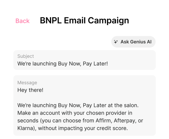 GlossGenius’s pre-built templates and marketing tools make it easy to let clients know you offer Buy Now, Pay Later.