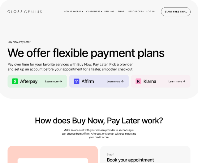 You can also share this page (https://glossgenius.com/how-buynowpaylater-works) with clients—it walks them through how BNPL works and how they can sign up.