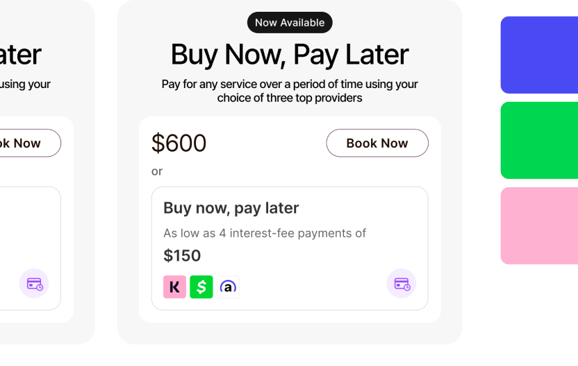 No single provider lock-ins. Clients can choose from multiple trusted Buy Now, Pay Later providers — Affirm, Afterpay, and Klarna — making it easier to say “yes.”