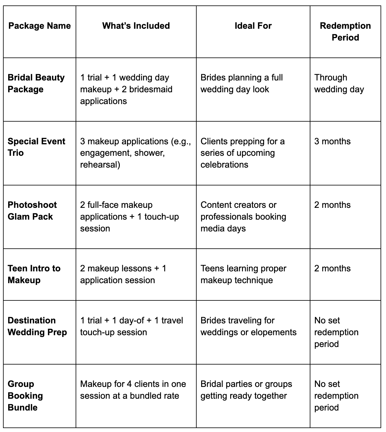 Makeup clients often book around a series of events—not just one. Packages help you capture more of that timeline while collecting payment upfront. Whether it's for bridal, photoshoots, or seasonal glam, bundles make planning easier and help you secure repeat bookings. These package ideas can help you structure your services for maximum impact.