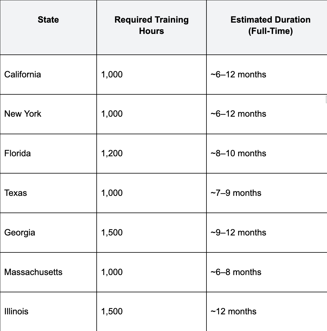At minimum, most programs require around 1,000 to 1,600 hours of training. For example, states like California and Texas require 1,000 hours, which you can complete in about six to eight months as a full-time student. On the other hand, states like Georgia and Illinois require closer to 1,500 hours, meaning it could take nine months to a year.