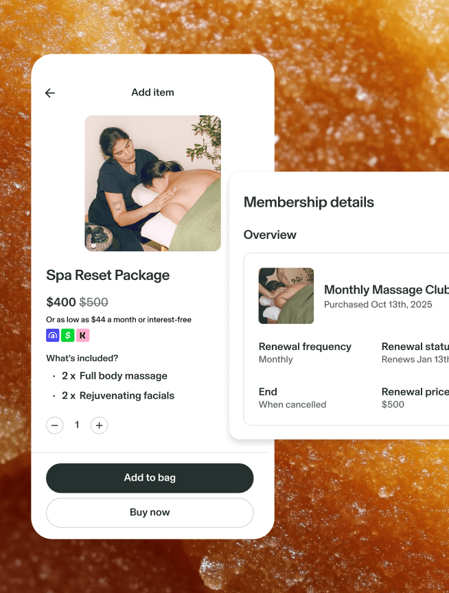 Sell prepaid packages and recurring memberships in person or online. Clients save on services, while you save time with automated redemptions and renewals.